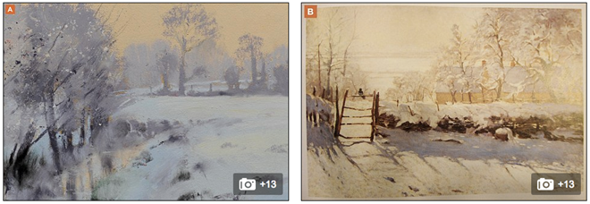 “Dạo bước giữa mùa đông diệu kỳ”. Hai bức họa về một người cô độc đi giữa mùa đông băng giá có tuổi đời cách nhau 100 năm. Tuy nhiên, đâu là tác phẩm của Claude Monet, cha đẻ của trường phái ấn tượng và đâu là của “tiểu Monet” thời hiện đại? Có thể thấy nét vẽ khung cảnh mùa đông (phải) của Kieron cũng đem lại cảm xúc giá lạnh đầy chân thực, không kém mùa đông của Claude Monet (trái).