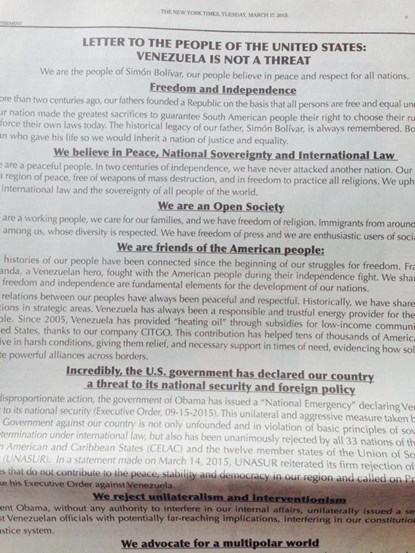 Trang quảng cáo của Venezuela trên tờ New York Times đã lên tiếng phản đối sắc lệnh hành chính của ông Obama, khi ông này tuyên bố Venezuela là mối đe dọa quốc gia: “Chưa bao giờ trong lịch sử dân tộc Venezuela, lại có một vị tổng thống Mỹ tìm cách thống trị người Venezuela bằng sắc lệnh. Đó là một sắc lệnh bạo ngược, áp đặt, đẩy mối quan hệ giữa hai nước vào những ngày đen tối nhất”.