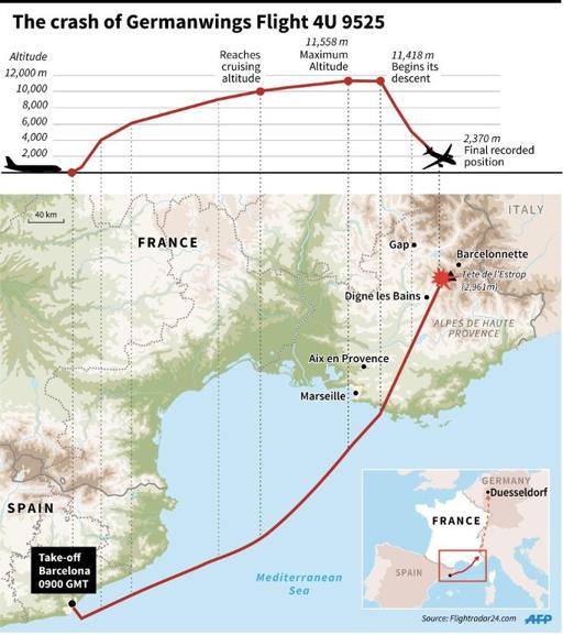 Các máy bay trực thăng đã được huy động tới địa điểm chiếc A320 bị rơi khi đang từ Barcelona tới Duesseldorf. Giới chức Pháp khẳng định đã không nhận được bất cứ cuộc gọi khẩn nào trước khi máy bay rơi xuống núi. Tuy nhiên, họ đã thu hồi được hộp đen ghi âm buồng lái – là một trong hai hộp đen ghi lại dữ liệu chuyến bay - từ hiện trường vụ việc ở cách mực nước biển 2.000m. “Chiếc hộp đen đã bị hư hại. Trong những giờ tới, chúng tôi sẽ tiến hành lấy dữ liệu để tìm hiểu về thảm kịch” – Bộ trưởng Nội vụ Pháp Bernard Cazeneuve cho hay.
