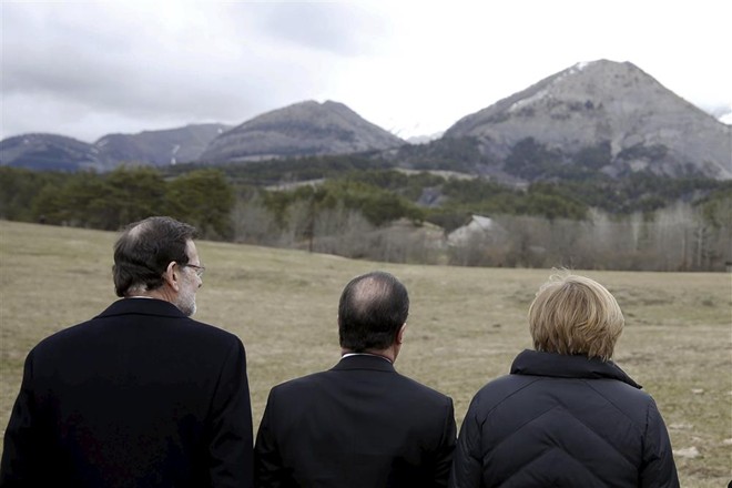 Hollande, Thủ tướng Đức Angela Merkel và Thủ tướng Tây Ban Nha Mariano Rajoy cùng nhiều quan chức của 3 nước đã tới khu vực gần hiện trường máy bay rơi hôm 25/4.