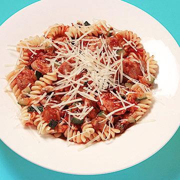 Luộc mỳ Ý đến khi mỳ chín thì vớt ra bát và cho một ít dầu vào đảo đều. Cho hỗn hợp gồm: nước sốt nóng spaghetti, xúc xích, tỏi và các loại rau vào xào trong khoảng 12 phút, cho đến khi rau mềm. Đổ nước sốt lên trên mì ống và rắc phô mai.