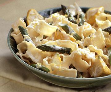Luộc mỳ Ý đến khi mỳ chín thì vớt ra bát để ráo nước rồi cho một ít dầu ô liu vào đảo đều. Trong khi đó, ta cho bơ thực vật vào một chảo lớn rồi đổ măng tây, bí, và tỏi vào đảo đều trong 2-3 phút hoặc cho đến khi rau mềm, đảo hỗn hợp thường xuyên. Cho kem whipping và vỏ chanh vào chảo đảo tiếp đến khi sôi. Đun sôi hỗn hợp trong 2-3 phút hoặc cho đến khi bạn thấy hỗn hợp sánh lại. Sáu đó đổ hỗn hợp kem lêm trên đĩa mì ống.