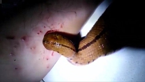 Trong đoạn video được quay dưới ánh sáng của một chiếc đèn pin này, con đỉa khổng lồ dài gần 40 cm và to gần bằng cổ tay người lớn này đang bám chặt vào tay của chủ nhân để hút máu. Trên cánh tay của thanh niên này cũng chi chít những vết cắn của đỉa, dấu tích của những lần hút máu trước đó.