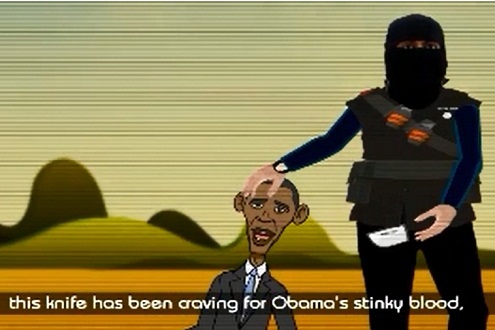Video hoạt hình cho thấy Tổng thống Obama mặc bộ quần áo xám và đeo cà vạt xanh quỳ gối bên cạnh chiến binh thánh chiến IS