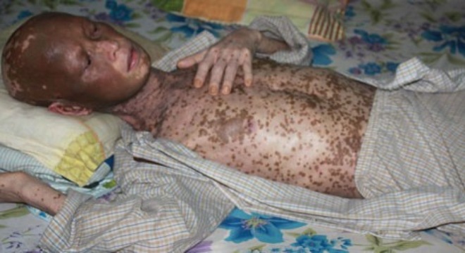 Đó là trường hợp anh Huỳnh Văn Điền (ngụ tại huyện Chơn Thành - Bình Phước). Anh bị mắc 1 căn bệnh lạ khiến toàn thân loang lổ đen sạm, da bị lột như da rắn, tai nặng khó nghe, mắt mờ không nhìn rõ.
