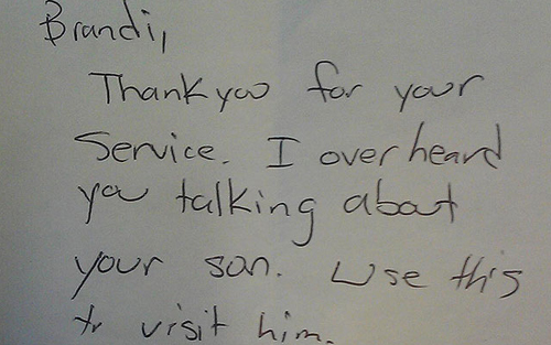 Đi kèm với khoản tiền boa bất ngờ của vị khách là một tờ giấy có viết: “Brandi, cảm ơn vì sự phục vụ. Tôi rất cảm động về chuyện cô và con trai. Hãy dùng số tiền này để đi thăm thằng bé".