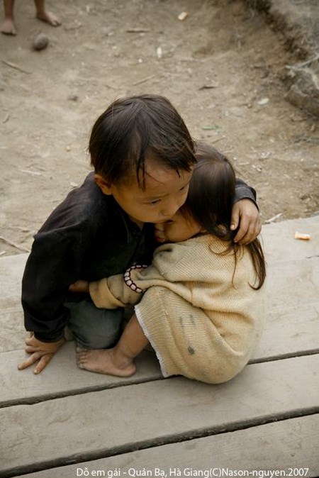 Phóng viên ảnh thuật lại rằng khi đi ngang ngôi làng, anh thấy 2 đứa trẻ người H’mông đang ngồi chơi trước nhà lúc cha mẹ làm việc ngoài đồng.