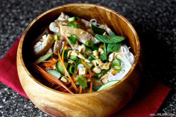 Cho mì vào bát sau đó đến rau thơm, thịt gà, rưới ít nước chấm, nước sốt cho vừa miệng, dưa chuột, hành lá thái nhỏ. Rắc lạc rang giã rối và vắt ít chanh lên trên rồi thưởng thức.