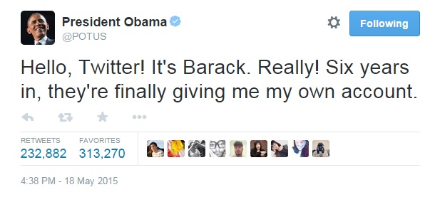 "Chào Twitter! Barack đây. Đúng là tôi đấy! Làm Tổng thống được 6 năm, cuối cùng thì tôi cũng có tài khoản riêng" - nội dung tweet đầu tiên từ tài khoản mới của Tổng thống Mỹ