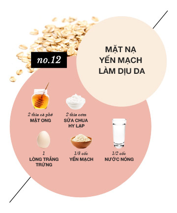 * Cách làm: Trộn đều yến mạch và nước nóng, để trong 2 phút. Trộn đều hỗn hợp với các thành phần khác và bôi một lớp mỏng trên da, để nguyên và rửa lại sau 15 phút.