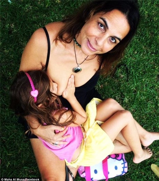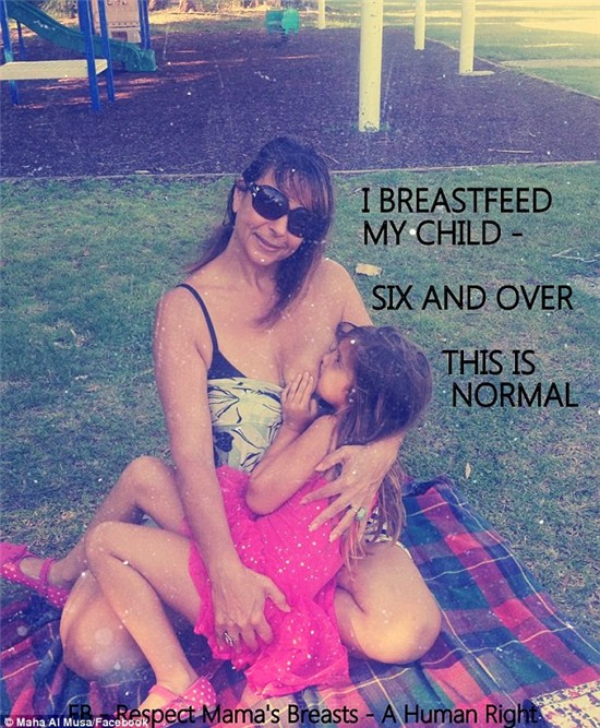 Maha Al Musa, năm nay 52 tuổi, hiện đang sống tại Byron Bay, New South Wales đã gây chú ý với bộ ảnh cho con gái, vẫn mặc đồng phục đi học, bú sữa mẹ trong công viên. Cô Al Musa cho biết con gái Aminah năm nay 6 tuổi nhưng vẫn thường xuyên bú sữa mẹ. Cô Al Musa cũng không cho con đi tiêm chủng vì hoàn toàn tin tưởng vào sức đề kháng từ sữa mẹ.