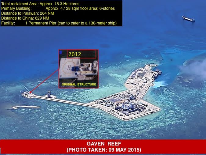 Đá Gaven (Ga Ven) có diện tích 4.128m2 vào thời điểm 2012, nay TQ đã xây trên diện tích 13.5ha. Ảnh chụp ngày 9/5/2015. Bộ Quốc phòng Philippines cung cấp.
