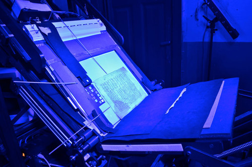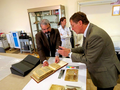Các nhà khoa học đang chụp lại ảnh bản thảo cổ bằng tiếng Syria ở vu viện Vatican. Ảnh: NY Times.