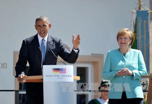 Thủ tướng Đức Angela Merkel (phải) và Tổng thống Mỹ Barack Obama phát biểu trong chuyến thăm làng Kruen, ngoại ô thành phố Garmisch-Partenkirchen ngày 6/7, trước khi khai mạc Hội nghị G7. Ảnh: AFP/TTXVN