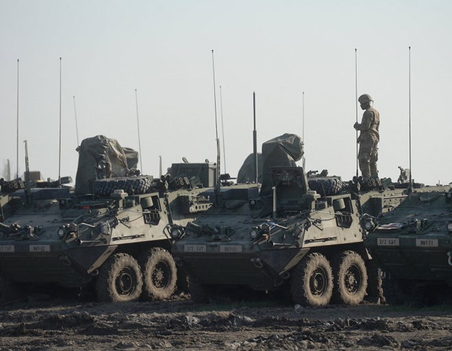 Xe quân sự Mỹ xếp hàng dài ở Zahony. (Nguồn: sputniknews)
