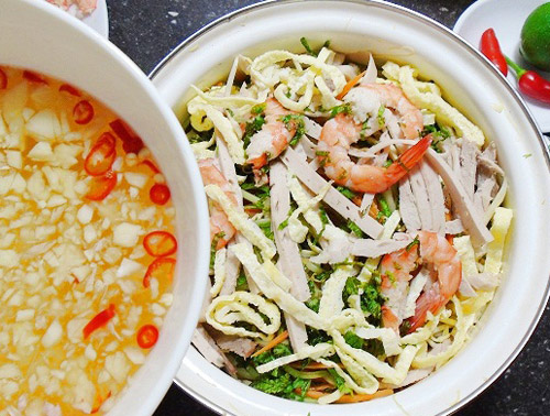 Bước 6: Cho gỏi tôm thịt ra đĩa dùng nem cuốn lại chấm với mắm chua ngọt.