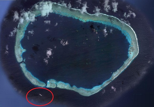 Một bức ảnh vệ tinh khác Global Times đăng tải cho thấy tàu chiến xuất hiện của tàu mang số hiệu 999 (vòng tròn đỏ) gần bãi đá Vành Khăn.