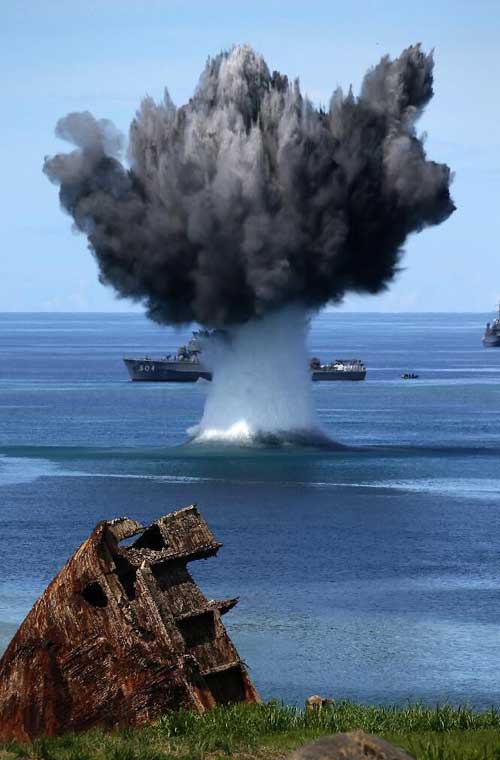 Trong ảnh, thủy lôi bị kích nổ tạo ra những cột nước cao tới hàng chục mét.