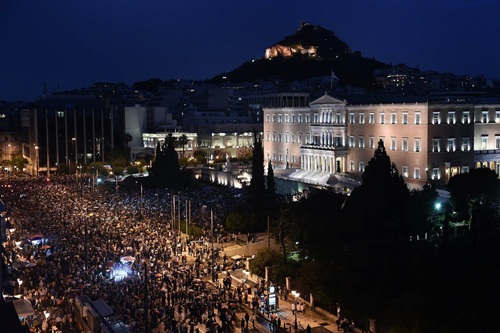 Người Hy Lạp biểu tình ủng hộ các biện pháp thắt lưng buộc bụng hôm qua tại Athens. Ảnh: Bloomberg