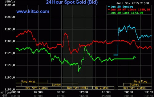 Biểu đồ giá vàng giao ngay trên Kitco cho thấy tình hình rối ren tại Hy Lạp không khiến giá vàng tăng vọt như thường thấy trong các cuộc khủng hoảng.