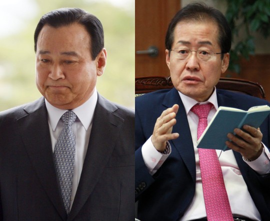 Cựu Thủ tướng Hàn Quốc Lee Wan-koo (trái) và tỉnh trưởng tỉnh Nam Gyeongsang Hong Joon-pyo (phải). Ảnh: Yonhap