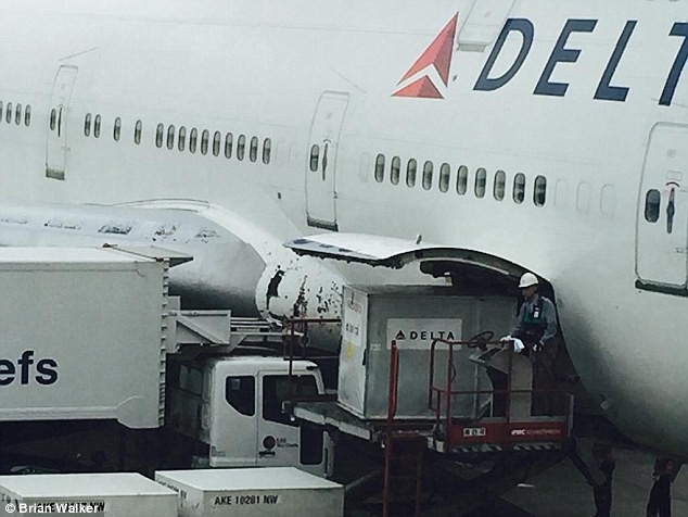 Thời tiết cực đoan để lại những "vết hằn" rất rõ trên thân máy bay Boeing 747. Ngoài phần mũi và thân, cánh máy bay cũng bị hư hại.