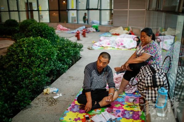 Ông Lưu Mao và vợ mình vừa mới làm thủ tục xuất viện vào ngày hôm qua nhưng do điều kiện khó khăn nên ông chưa bắt được xe về quê. Sân bệnh viện là nơi ông nghỉ qua đêm để chờ người nhà lên đón.