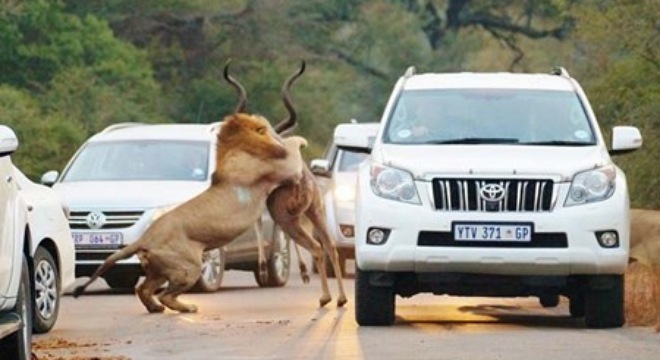 Một màn rượt đuổi cực kỳ ngoạn mục của một chú sư tử với một con linh dương ngay trước mặt du khách khiến ai cũng sững sở. Từ trong rừng, con sư tử bất ngờ lao ra vồ một con linh dương trên đường cao tốc. Có thể trong đời khó có ai có một lần được trực tiếp chứng kiến cảnh này.