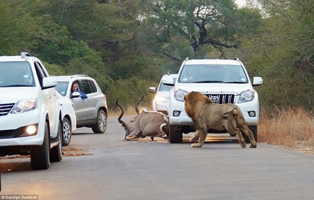 Hai con sư tử rượt theo và bất chấp xe cộ, một con ngoạm lấy lưng của con mồi. Con thứ hai lao đến và cắn vào cổ họng của con linh dương. Cả hai con sử tử đã săn thành công con linh dương", Carolyn cho biết.