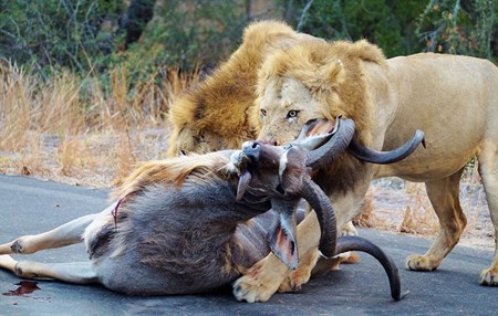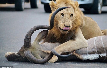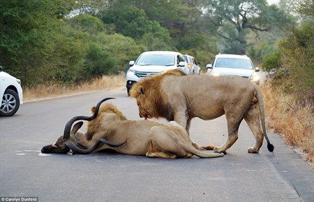 Nhiếp ảnh gia nghiệp dư người Anh Carolyn Dunford, 23 tuổi đã nhanh tay "chộp" được những bức ảnh ghi lại cảnh săn mồi ấn tượng của 2 con sư tử trưởng thành ngay trên đường cao tốc xuyên qua Công viên quốc gia Kruger - một trong những khu bảo tồn động vật hoang dã lớn nhất ở Nam Phi.