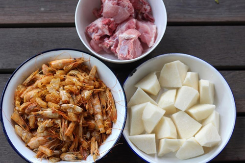 - 600g sườn heo; 3.5 lít nước; 500g đầu tôm và vỏ tôm. Xào với chút dầu ăn cho thơm; 500g củ đậu, cắt thành các miếng to; 30g đường phèn; 7.5g muối