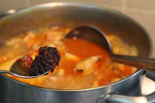 Nêm đường với muối vào. Khi nước dùng được, lọc hết các phần bã rồi thêm vào 1 thìa ớt chưng.
