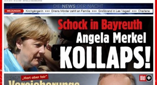 Một loạt báo chí và hãng thông tấn lớn của Đức đã đăng tin về sức khỏe của Thủ tướng Đức Angela Merkel. Cụ thể, đêm 25/7 tờ Bild đưa rằng Thủ tướng Đức Merkel đã bị té xỉu khi tham dự lễ khai mạc của một sự kiện văn hóa ở Bayreuth. Theo tờ báo này, bà bị ngã từ ghế xuống đất và đã ngất đi trong vài phút.
