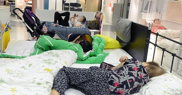Mặc dù công ty đã cấm nhưng "khách hàng" vẫn thoải mái ngủ lại trong cửa hàng Ikea như nhà của họ. photo courtesy : dailymail.co.uk