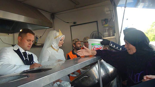 Cô dâu, chú rể tự tay trao đồ ăn cho người tị nạn. Ảnh: Kimse Yok Mu