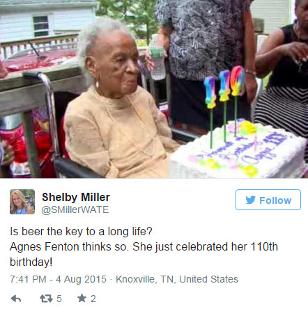 Theo tờ Dailymail ngày 4/6 đưa tin, với sinh nhật lần thứ 110 được tổ chức gần đây, cụ bà Agnes Fenton ở bang New Jersey (Mỹ) đã trở thành một trong những người sống thọ nhất trên thế giới. Tuy nhiên, cụ bà cũng cho biết mình không hề áp dụng bất cứ một chế độ ăn uống nghiêm ngặt nào cả.Do không có con cái nên hiện cụ bà Agnes đang sống tại nhà dưỡng lão ở thành phố Englewood, thuộc bang New Jersey. Trong một bài phỏng vấn của đài ABC News, cụ bà chia sẻ rằng ngoài khối u lành tính phát triển trong đầu hồi 30 tuổi, bà không gặp vấn đề nghiêm trọng nào về sức khỏe. Các bác sĩ khi đó đã khuyên bà nên uống ba cốc bia mỗi ngày và từ đó, cụ bà luôn kiên trì chế độ uống ba cốc bia và một ly rượu trong suốt 70 năm qua.Ngoài uống bia ra, bà Agnes còn có sở thích uống rượu, bà thường thưởng thức một ly Whiskey mỗi ngày. Thói quen này đã được duy trì trong thời gian dài nhưng gần đây do không thể ăn được nhiều thức ăn nên các y tá chăm sóc đã không để bà uống nhiều bia rượu nữa.