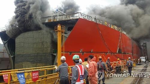 Con tàu chở khí hóa lỏng đang được đóng thì phát hỏa (Ảnh: Yonhap)