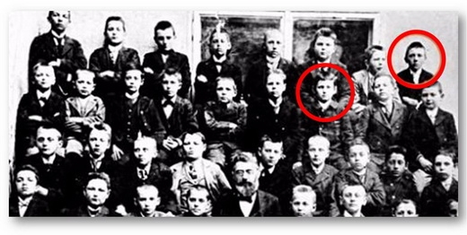 Người được khoanh dấu đỏ theo thứ tự từ trái qua phải: "học sinh giỏi" Ludwig Wittgenstein, "học sinh kém" Adolf Hitler.