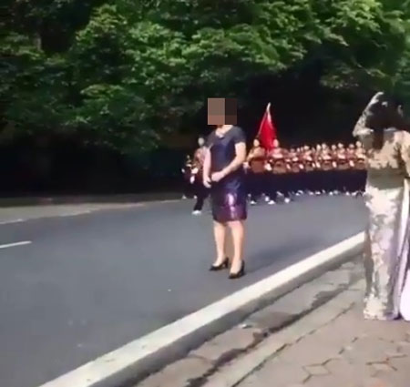 2 người phụ nữ đứng giữa đường, chặn đoàn diễu binh, diễu hành để chụp ảnh. (ảnh cắt từ clip)