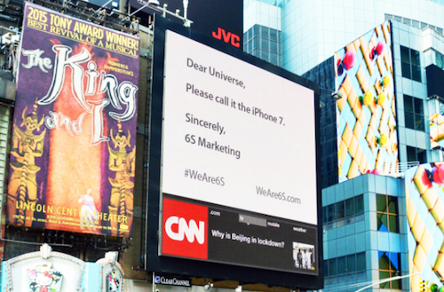 Trên tấm biển quảng cáo đặt tại Quảng trường Thời đại ở New York, 6S Marketing đã truyền tải thông điệp với nội dung: "Xin hãy gọi nó là iPhone 7". Đồng thời công ty này cũng quảng bá hình ảnh của mình bằng hastag #WeAre6S, họ nói rằng muốn "làm nổi bật văn hóa độc đáo và thú vị của công ty".