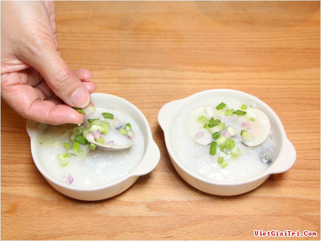 Múc cháo ra bát, rắc ít hành lá xắt nhỏ cùng tiêu rồi thưởng thức nhé!