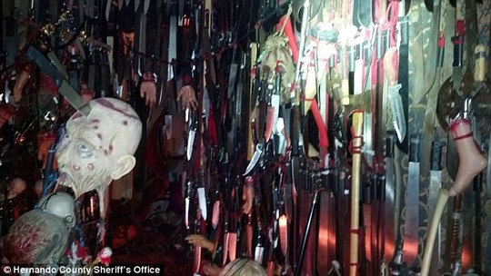 3.714 thanh mã tấu, kiếm và dao cùng hàng trăm bộ phận cơ thể và đầu lâu giả treo trong nhà bà Dykema. Ảnh: Daily Mail