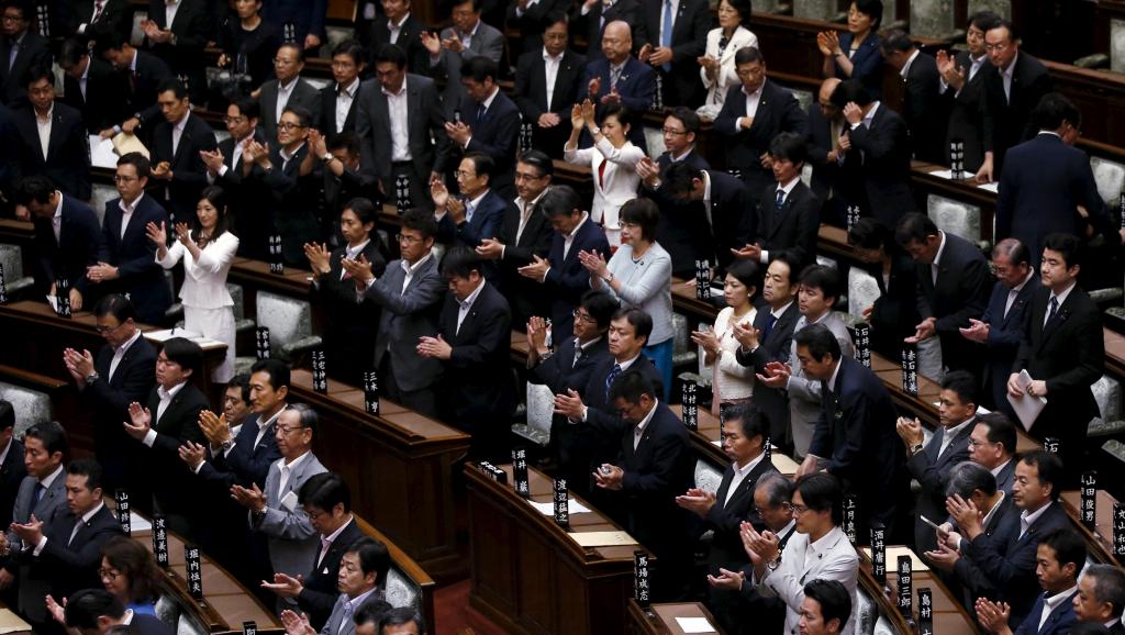 Các nghị sĩ Nhật vỗ tay sau khi Luật quốc phòng được thông qua ngày 19/09/2015 tại Tokyo. REUTERS/Toru Hanai