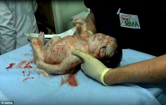 Theo tờ Daily Mail (Anh), hôm 18-9, một đoạn video được đội ngũ y tế ở TP Aleppo tung lên mạng Internet cho thấy các bác sĩ gấp rút mổ cấp cứu cho một thai phụ bị mảnh bom văng trúng bụng. Họ lấy được em bé ra ngoài và bước đầu hô hấp nhân tạo để bé thở lại. Đứa trẻ mang giới tính nữ.