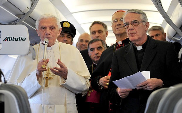 Giáo hoàng Benedict XVI phát biểu trước các phóng viên trên chuyến bay của Alitalia trước khi hạ cánh xuống sân bay Tegel ở Berlin tháng 6/2011. Ảnh: AFP