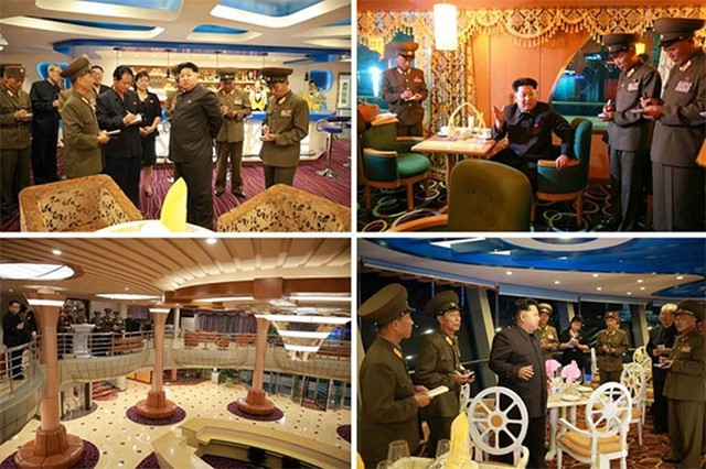 Nhà lãnh đạo Kim Jong Un bên trong Mujigae. Du thuyền gồm nhà hàng, quán bar, cafe, khu vực ăn uống riêng. Hồi tháng 9 năm ngoái, NK News đưa tin về việc Mujigae đang trong quá trình xây dựng. Ảnh: KCNA