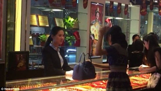 Trong đoạn video được quay và đăng tải lên mạng ngày 25-9 ở TP Hàm Đan, Đông Bắc Trung Quốc, một phụ nữ khá trẻ, ăn mặc sành điệu bước vào một cửa hàng nữ trang để chọn trang sức vàng. Không rõ nhân viên bán hàng nói gì khiến cô gái nổi đóa và la hét ầm ĩ.