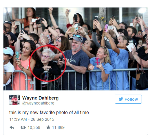 Nhưng lẫn trong đám đông ấy là một nhân vật đặc biệt, cũng chính nhân vật này đã khiến bức ảnh có sức lan tỏa khổng lồ trên Internet suốt thời gian qua. Đó là một bà cụ mặc áo đen, tóc đã bạc trắng. Bà đứng dựa vào hàng rào, tận hưởng không khí vui tươi, và chỉ tận hưởng mà thôi, không điện thoại, không máy ảnh, chỉ đứng dõi theo và cảm nhận sức sống xung quanh.