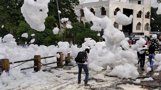Lớp bọt dày và nhẹ bay lan ra khắp nơi trong thành phố tạo nên cảnh tượng vừa kinh ngạc, vừa sởn gai ốc. Mỗi khi gặp trời mưa, mặt hồ Bellandur ở Bangalore, Ấn Độ lại sủi bọt độc trắng xóa bay khắp thành phố tạo nên một cảnh tượng vừa đáng kinh ngạc, vừa khiến người xem gai người.