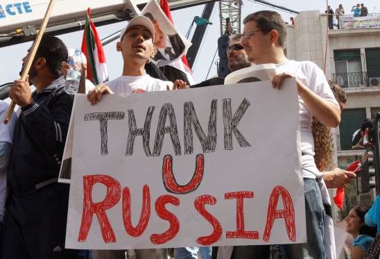 Người ủng hộ chính phủ Syria từng giơ biển cảm ơn nước Nga vào năm 2011 khi Nga và Trung Quốc bỏ phiếu phủ quyết nghị quyết của Hội đồng Bảo an Liên Hợp Quốc chống lại Damascus. Ảnh: AP